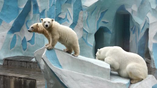 Медвежата Белка и Стрелка дружно играют в вольере и плавают в бассейне.