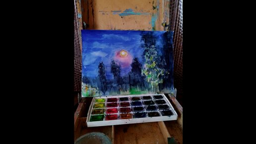 Акварель по мокрому листу - лунный пейзаж - рисунок поэтапно