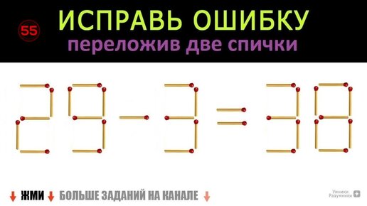 Головоломка со спичками 🥢 29-3=38 😎 Исправь ошибку переложив только две спички ⚡️ Математический тест