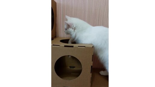 Глуховатый кот Чип весело играет в своем новом домике