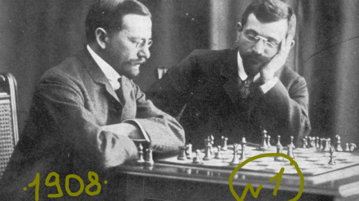 Непробиваемый Ласкер играет очередной матч за шахматную корону. Зигберт Тарраш с первой же партии понял, что будет сложно (Дюссельдорф, 1-0)