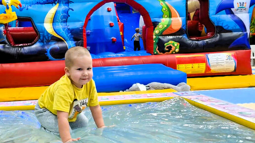 1 Ребенок играет в песочнице и толкает паровозик на детской площадке