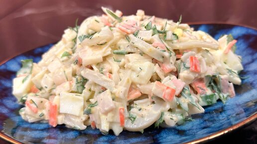 Салат с кальмарами. Всего 3 ингредиента. Все дело в заправке. Очень вкусный и полезный салат!