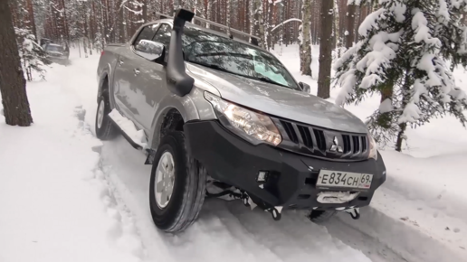 Мужик на Mitsubishi l200 не может проехать за УАЗом и Нивой по сугробам на бездорожье.