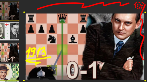 Молодой Александр Александрович, играя черными, уверенно пришел к победе, сражаясь по центру против Жака Мизеса в Нидерландах, 1913, 0-1