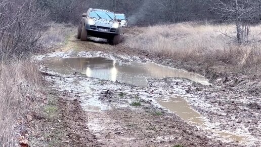 Старенький Porsche Cayenne S с V8 показывает как надо ехать по бездорожью и по грязи