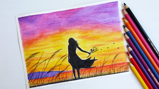 Как нарисовать девушку с цветами на закате акварельными карандашами