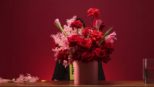 Букет в стиле LBA. Букет в шляпной коробке в красно-розовых тонах