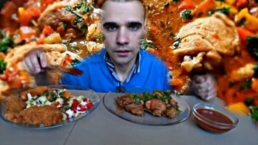 МУКБАНГ ЧАХОХБИЛИ ИЗ КУРИЦЫ С ПОМИДОРАМИ И БОЛГАРСКИМ ПЕРЦЕМ / САЛАТ ЦЕЗАРЬ / СТРИПСЫ / EATING Mukbang ASMR / АСМР 먹방 #838