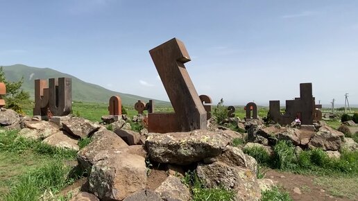 Памятник армянскому алфавиту по дороге в Ереван. 39 букв в высоту человеческого роста создали к 1600-летию создания армянской письменности.