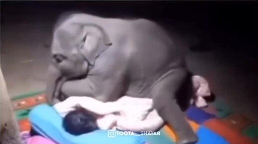Слоненок пытается спать рядом со смотрителем зоопарка, который за ним ухаживает