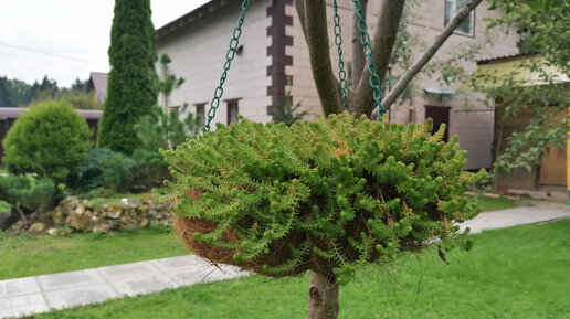 Седумы в подвесных кашпо на яблонях в сентябре 2023
