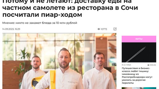 Новости туризма 14/09/2023 Потому и не летают: доставку еды на частном самолете из ресторана в Сочи посчитали пиар-ходом #туризм #сочи