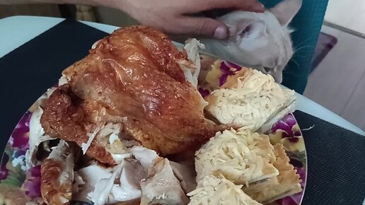 Кот пытается стянуть курицу.