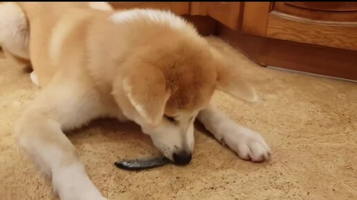АКИТА ИНУ ПЕРВЫЙ РАЗ В ЖИЗНИ ЕСТ РЫБКУ. УДИВЛЯЕТСЯ, НО ЕСТ. СЕРИЯ №12