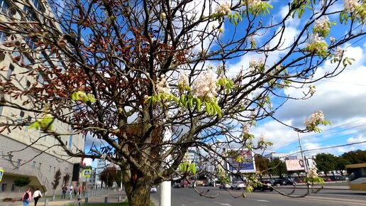 Осенью зацвел каштан в Калининграде прощаясь с Домом Советов