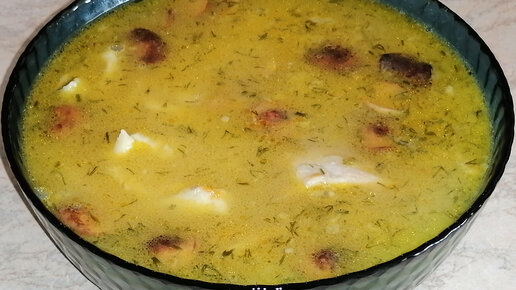 Гороховый суп на свиных рёбрышках с чесночными рулетиками и сосисками