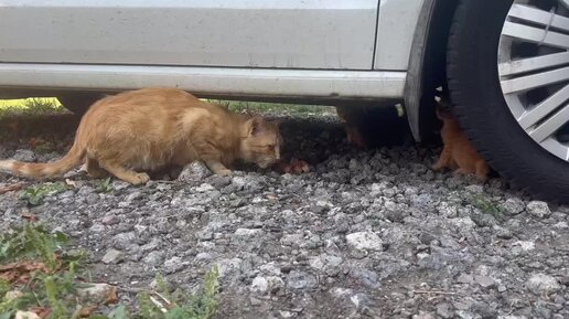 Кошачья семейка ест прям у машины