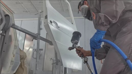 Маляр наносит кислотный грунт на двери и кузов "гелика"