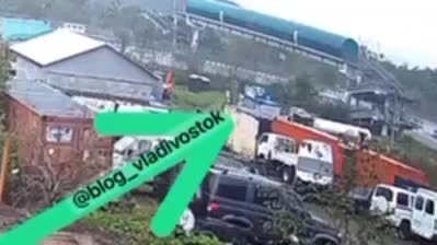 Момент эпического обрушения виадука на Садгороде во Владивостоке. В сооружение на полной скорости въехал грузовик с поднятым кузовом.