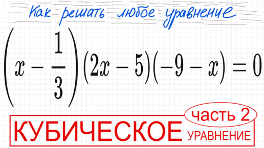 №1 Кубическое уравнение со скобками (х-1/3)(2x-5)(-9-x)=0 Как решить уравнение со скобками Как решить уравнение третьей степени 9кл ОГЭ ЕГЭ