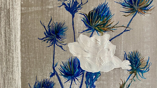 Рисую с натуры чертополох и розу в смешанной технике: масляная пастель, тушь, акрил, тонированная бумага.