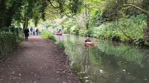 Байдарочник с неистово счастливым лицом опережает неповоротливую прогулочную лодку, Кромфордский канал, Англия