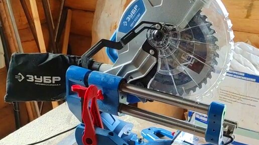 Показываю, как обрезать ровно длинные доски на торцовочной пиле.