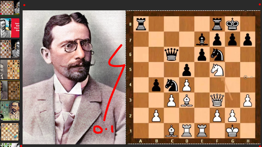 Зигберт Тарраш (черные) хладнокровно гнет свою линию, обыгрывая Рудольфа Шпильмана в шахматы. Контргамбит Фалькбеера (Острава, 1923, 0-1)