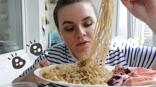 Мукбанг лапша с соусом терияке, форель, осьминожки
