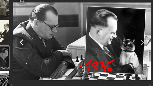 Великий А. Алехин в "год бесчемпионства" не потерял формы - красиво обыгрывает Милана Видмара за шахматной доской в Гастингсе, 1936, 1-0