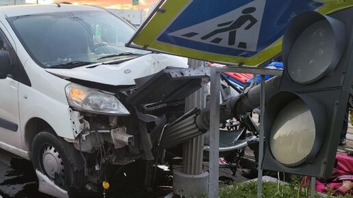 Ехавший на буксире по Ириновскому проспекту микроавтобус снес светофор, врезался в столб и сломал обе ноги велосипедисту