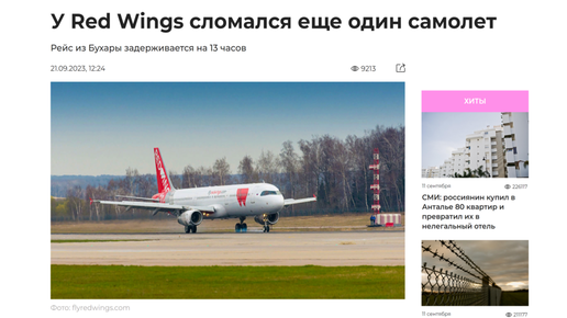 Новости туризма 21/09/2023 У Red Wings сломался еще один самолет #туризм