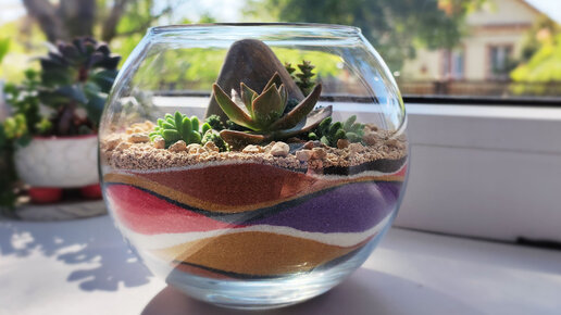 Флорариум из суккулентов своими руками - это очень просто. Показываю пошагово, как сделать композицию с растениями и цветным песком.