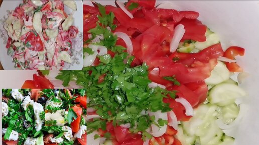 Салат рецепт. Салат из огурцов, помидор, болгарского перца с добавлением лука и зелени. Готовим быстро.