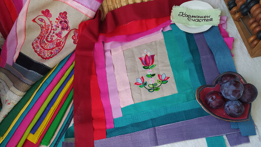 Примерка-игра! Лоскутный водоворот вокруг вышитого мотива - растëт льняное одеяло. Лоскутное шитье, блок изба, колодец
