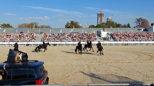 Верховая езда на черных лошадях и машинах. Крутое конное шоу