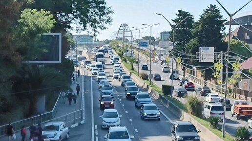 Автомобильные пробки стали проблемой Сочи, особенно в этом курортном сезоне. Виды дорог и дорожных развязок в районе ЖД вокзала Адлера.