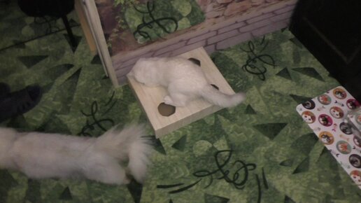 Котенок Снежок играет пытается доставть жёлуди из коробочки