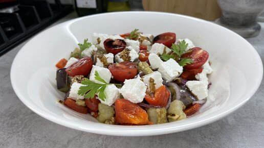 Теплый салат с баклажанами, перцем и сыром Фета