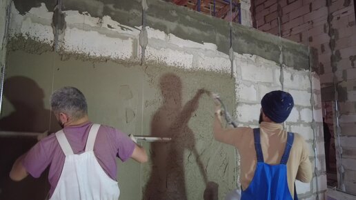 Механизированное нанесение известково-цементной штукатурки Baumit MPI25 на газобетонные стены по штукатурным маячкам, технология нанесения