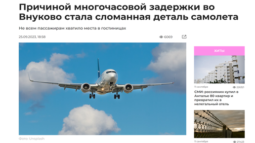 Новости туризма 25/09/2023 Причиной многочасовой задержки во Внуково стала сломанная деталь самолета #туризм