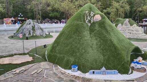 Горы Кавказских Минеральных Вод, выполнены в миниатюре. Инсталляция находится в парке Железноводска у озера Тридцатка.