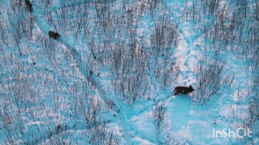 Стадо кабанов на зимней тропе. A herd of wild boars on a winter trail