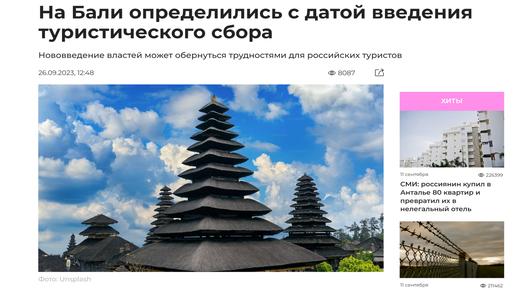 Новости туризма 26/09/2023 На Бали определились с датой введения туристического сбора #туризм