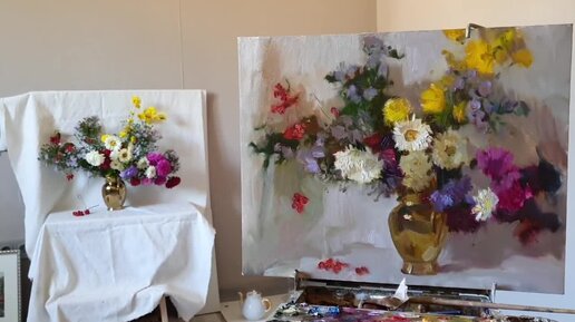 Осенние цветы. Живопись маслом. Как влияет лохматость кисти на качество живописи.