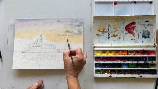Акварельный пейзаж по сырому. Процесс рисования. Живопись.