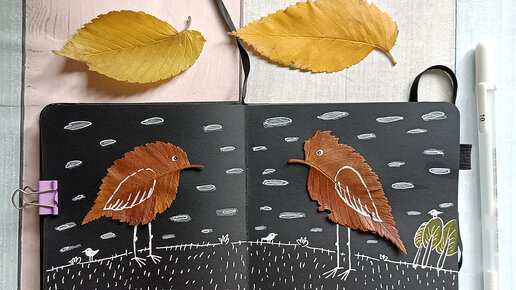 Разворот скетчбука. Осенние листья 🍂, белая гелевая ручка
