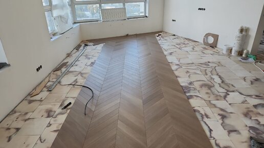 Укладка инж. доски "Гермес Паркет", рисунок французская ёлочка, на фанеру с использованием грунтовки и 2К ПУ клея FESTWOOD.