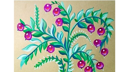 🌿🟣🌿Ветка с ягодами. Декоративное рисование гуашью используя кисть-губку.